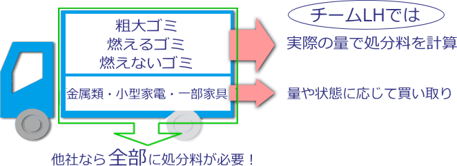 チームLHでは買取りできる品物を除外して、実際に処分しなければならない不用品や、遺品の全体の容積で料金を計算します。金属、家電品、紙類、古着、プラスチック類は原料として買取り、再販売可能な家財は徹底して買い取ります。